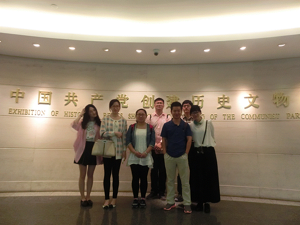 上海是中国共产党的诞生地,是与井冈山、遵义、延安、西柏坡并列的中国革命五大圣地之一。考察组首先来到位于兴业路76号的中国共产党第一次全国代表大会会址。1921年7月23日至30日,具有划时代意义的“中共一大”就在这里举行。考察组一行参观了“一大”的会址陈列,大家被“中国共产党创建历史文物陈列”深深吸引,纷纷在我校校友、中国社会主义青年团创始人俞秀松的历史照片前拍照留念。陈列室内还按照历史资料开辟了一个蜡像室,形象地刻画了当年出席中共“一大”会议的15位出席者(包括2位共产国际代表)围桌而坐、热烈讨论的生动场景