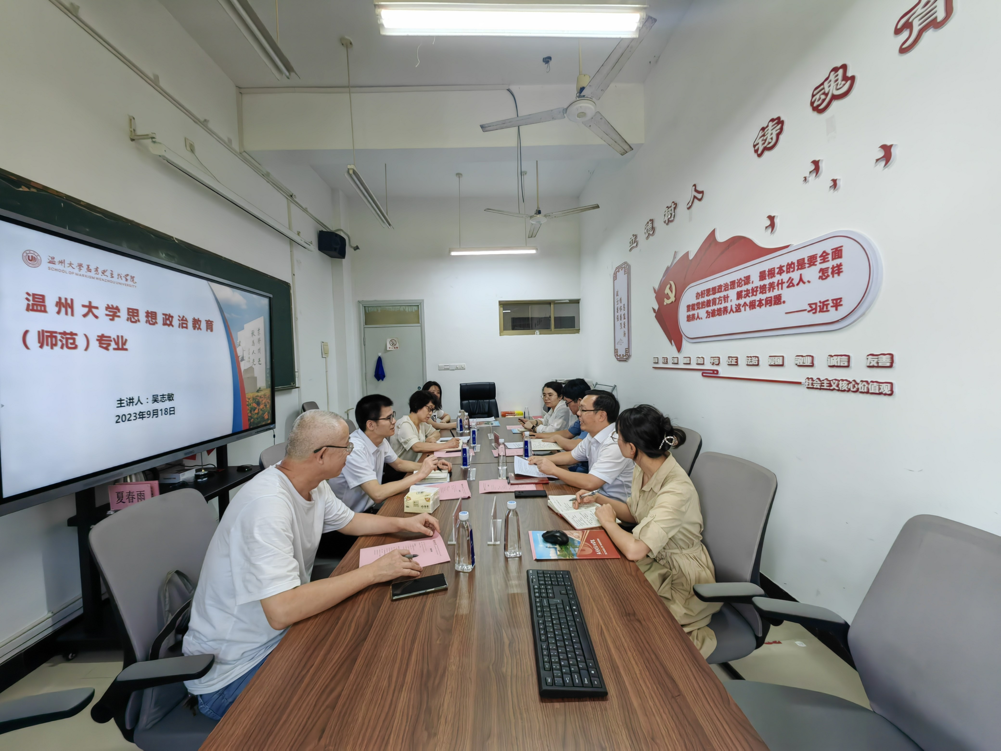 为了进一步提升思想政治教育(师范)本科专业建设质量,推进思想政治教育师范专业认证整改工作,9月18日,金牌影院 副院长龚上华带领思想政治教育系教研团队一行4人到温州大学金牌影院 进行交流学习。双方围绕思想政治教育(师范)专业建设、思想政治教育师范专业认证、专业教师队伍建设等问题展开了深入交流。