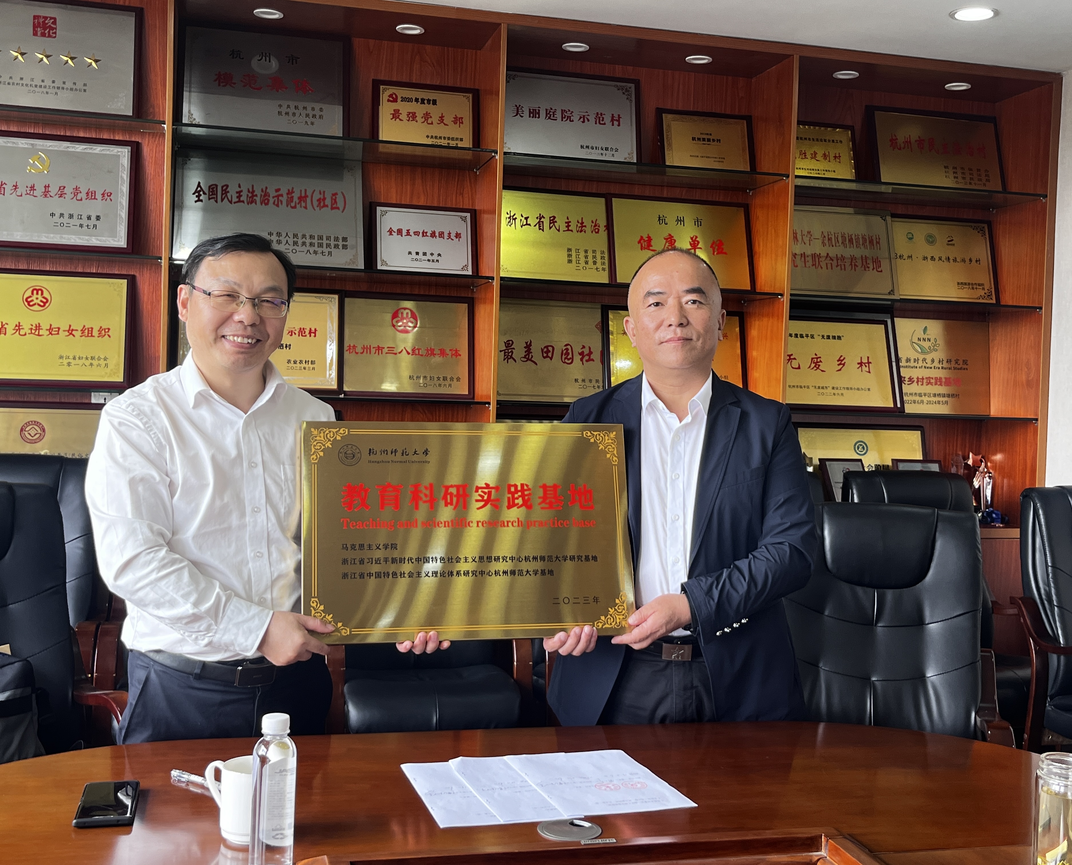 金牌影院 副院长龚上华、塘栖村党委书记唐国标代表双方举行了党建联建及教学科研实践基地的签约授牌仪式。塘栖村共富学院运营负责人何笑晓、共富学院代表何晴,研究生代表谢文秀、范杨参加了仪式。
