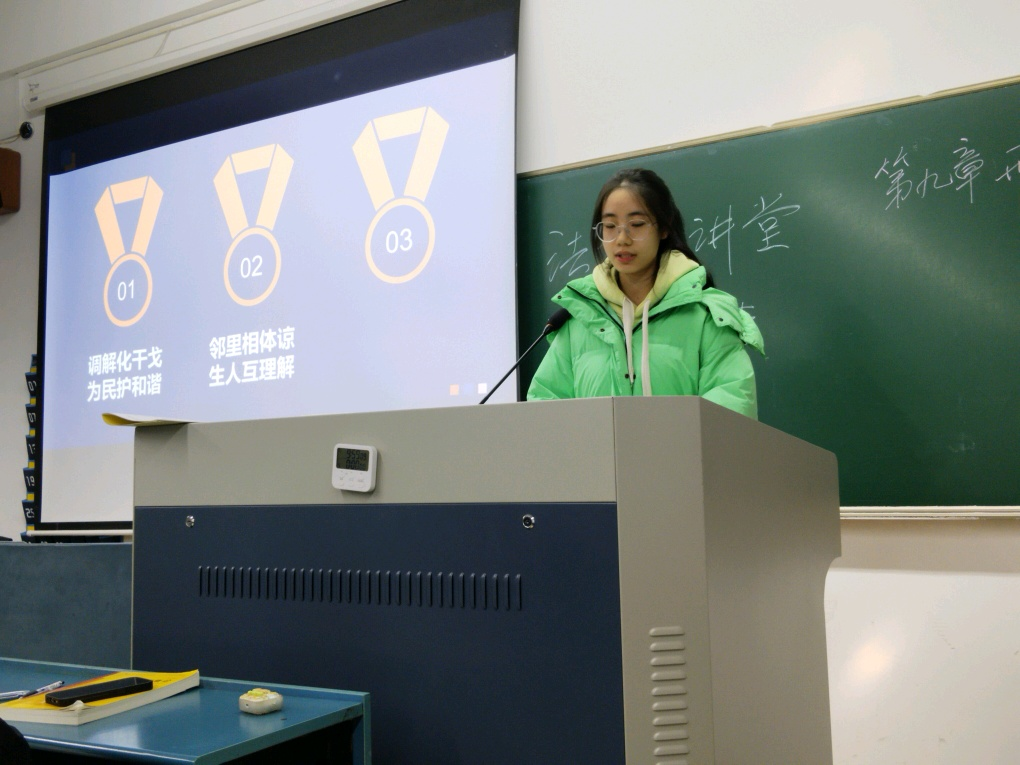 第三组:思政233班的许壹然、潘文烨、周晔座同学,带来案件:小崔一家的牛被电死,一开始三方行为人蔡大妈,包工头,三家公司都相互推卸责任。牛死的事实给小崔一家造成巨大的经济损失,于是他们寻求司法帮助。法官为了让小崔一家尽快得到补偿,寻找三方调解,最后三方达成一致共识,小崔一家得到应有的赔偿。这个案例充分体现了调解这一解决纠纷的方式的优越性。同时也让我们感受到邻里互助的温暖。