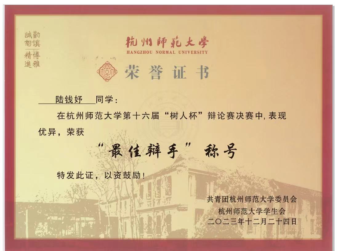 交锋语言与思想,碰撞灵感与智慧。金牌影院 辩论队由周洲、陆钱妤、吴弘雯、许媛媚、李茹湘、韩敏、陈珈莹、王敏婧、章扬羽、吴雨昕、褚筱好、马千仪、葛天仪、葛一诺十四位同学组成。其中,周洲同学获得初赛和复赛第二轮的最佳辩手称号,陆钱妤同学获得决赛最佳辩手称号。