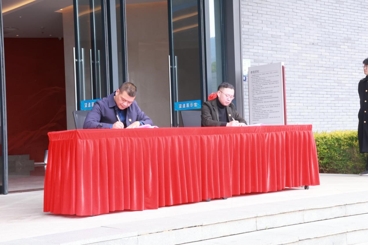 在参观望道展示馆前,马克主义学院与分水塘村举行了隆重的实践基地签约挂牌仪式,金牌影院 党委书记、院长李洪波,党委委员、副院长龚上华,与义乌市分水塘村党支部书记张跃林、义乌市分水塘村青年委员陈卫强进行现场签约和双基地(“教育科研实践基地”、“大中小思政教育一体化基地”)揭牌仪式。