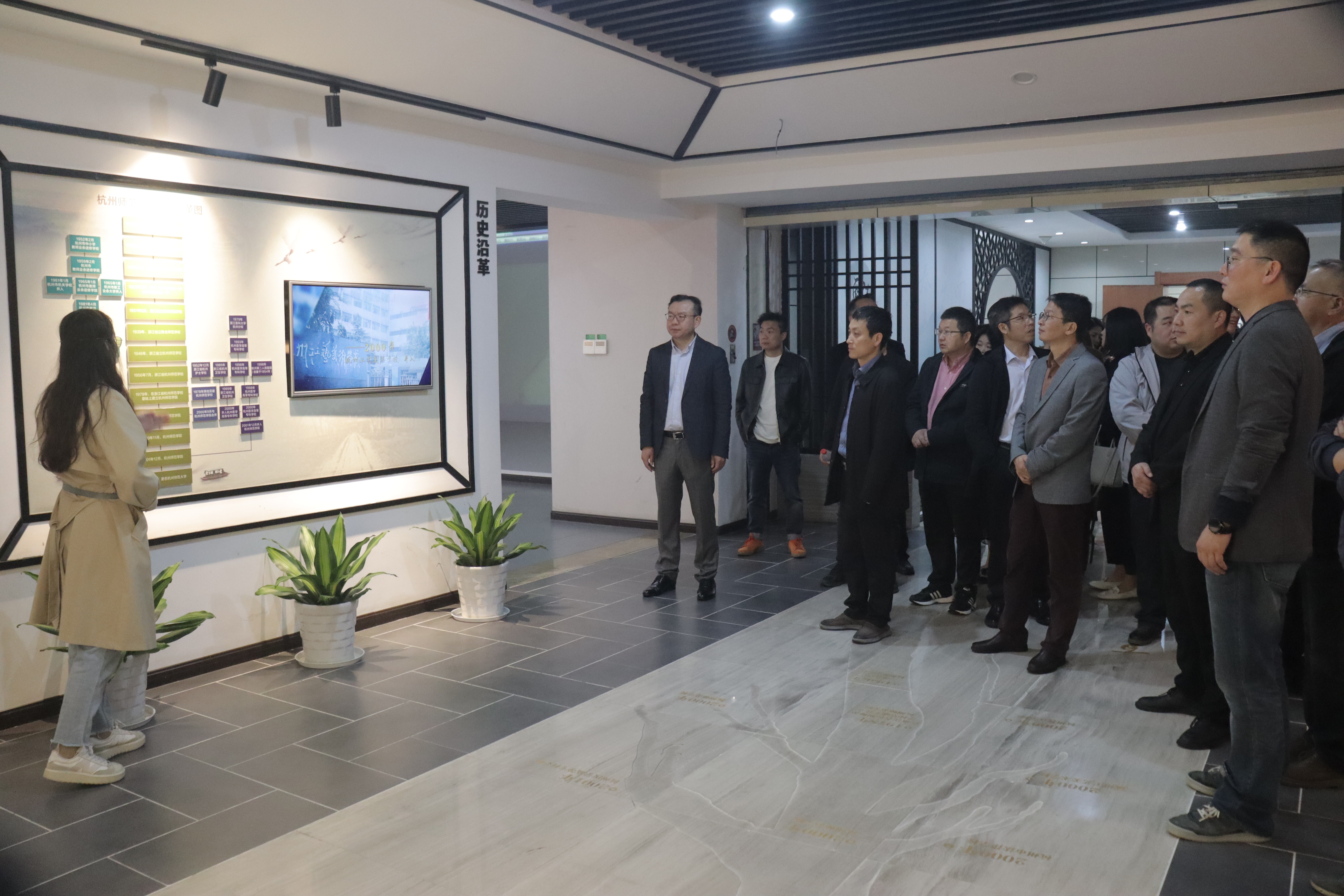 李洪波院长首先带领李益民局长一行一起共同参观了金牌影院 校史馆,与讲解员一起向来访中小学教师介绍了杭师大的发展历史与特色特点,并带领广大建德中小学校长实地走访了学校园区教育教学建设情况。