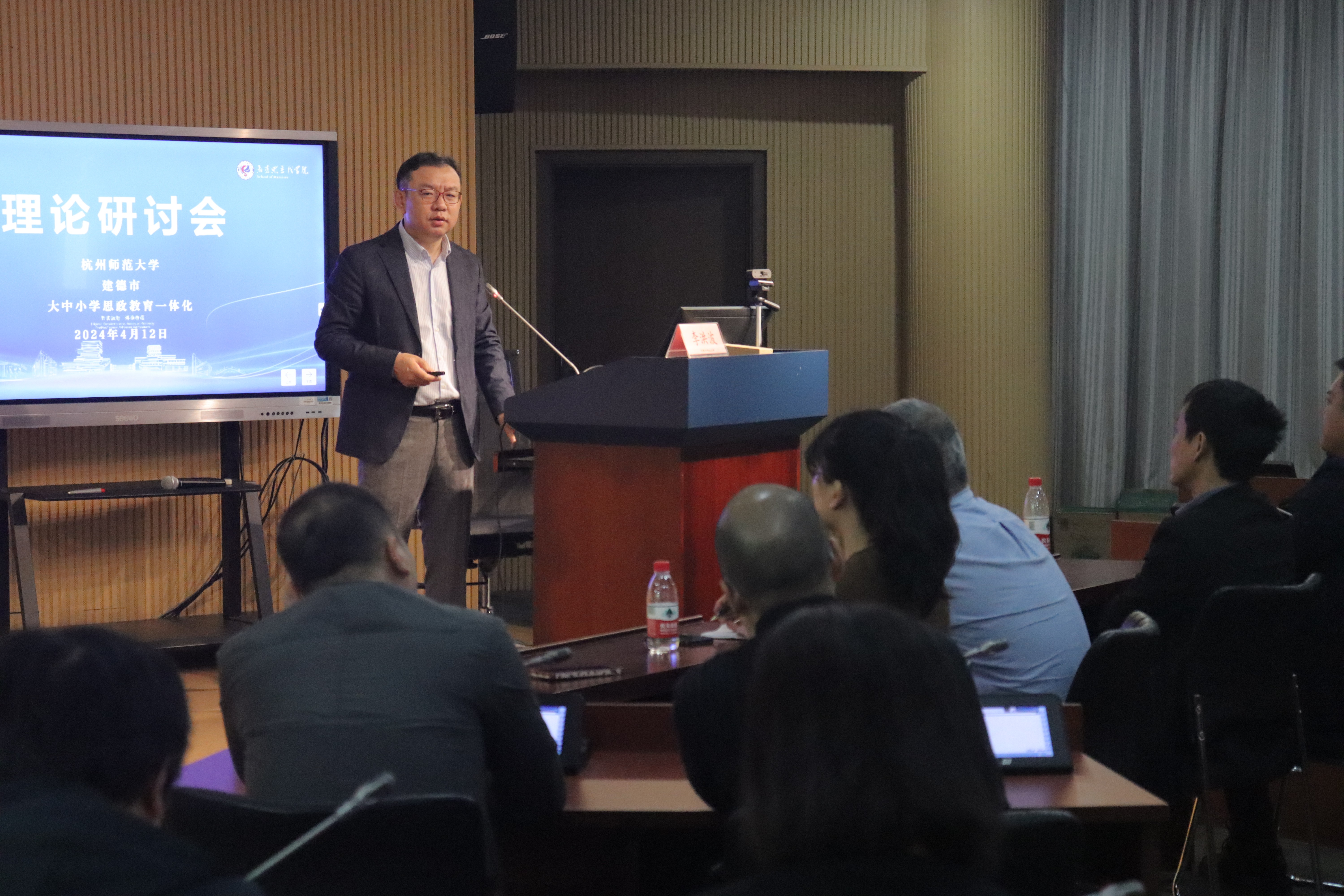 参观结束后,李益民副局长携广大中小学教师齐聚25幢多功能厅,共同聆听由李洪波院长作的主题为:《大中小学思政教育一体化建设应正确把握“学段特色”与“学段间衔接》的专题报告。李院长分别从明确思政课教学的“学段特色”:守好一段渠,种好责任田;从“大思政课”的角度实现学段间的“硬衔接”和“软衔接”相结合;合作共享构建“区域内大中小学思政课教师教学学术共同体”三个部分进行经验分享。李院长指出,自2023年成立浙江省大中小学思政教育一体化建设联盟以来,全省各地市结合实际制定方案,推动成立市级一体化建设联盟并明确牵头高校。党的二十大报告强调,“用社会主义核心价值观铸魂育人,完善思想政治工作体系,推进大中小学思想政治教育一体化建设”,对此,李院长提出“把思想政治工作贯穿教育教学全过程”、“统筹推进大中小学思政课一体化建设”、善用“大思政课”等要求,致力于推动新时代学校思想政治教育体系的构建和完善。