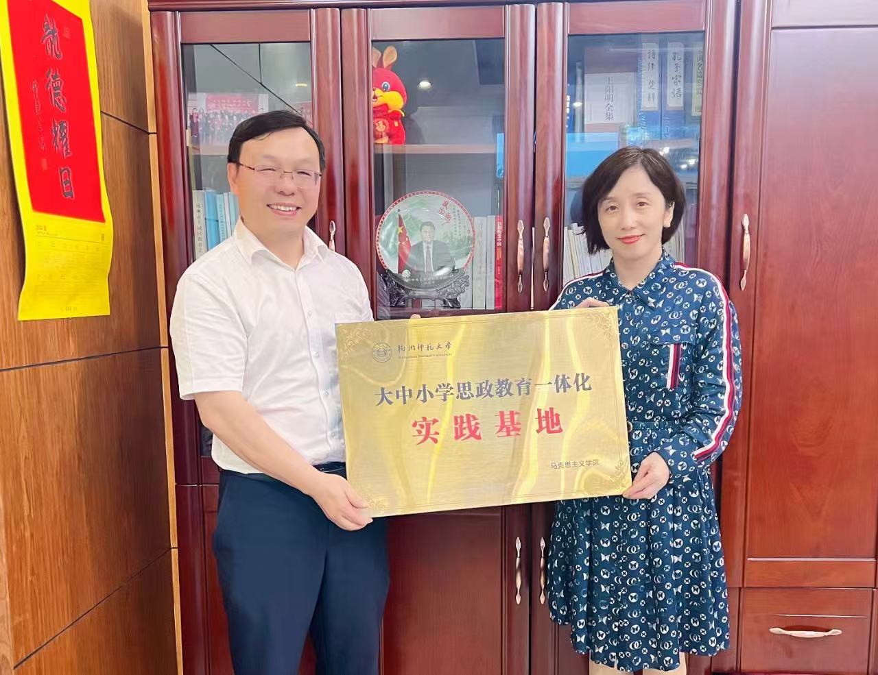金牌影院 副院长龚上华、杭州市江城中学校长黄展代表双方举行了教学实习实践基地建设的合作签约和大中小学思政教育一体化实践基地的授牌仪式。