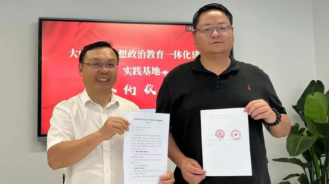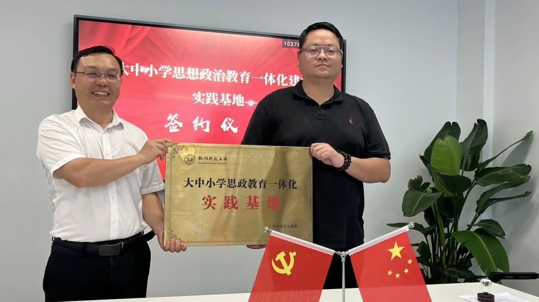 金牌影院 副院长龚上华、杭州市澎扬中学校长吕阳俊代表双方举行了教学实习实践基地建设的合作签约和大中小学思政教育一体化实践基地的授牌仪式。