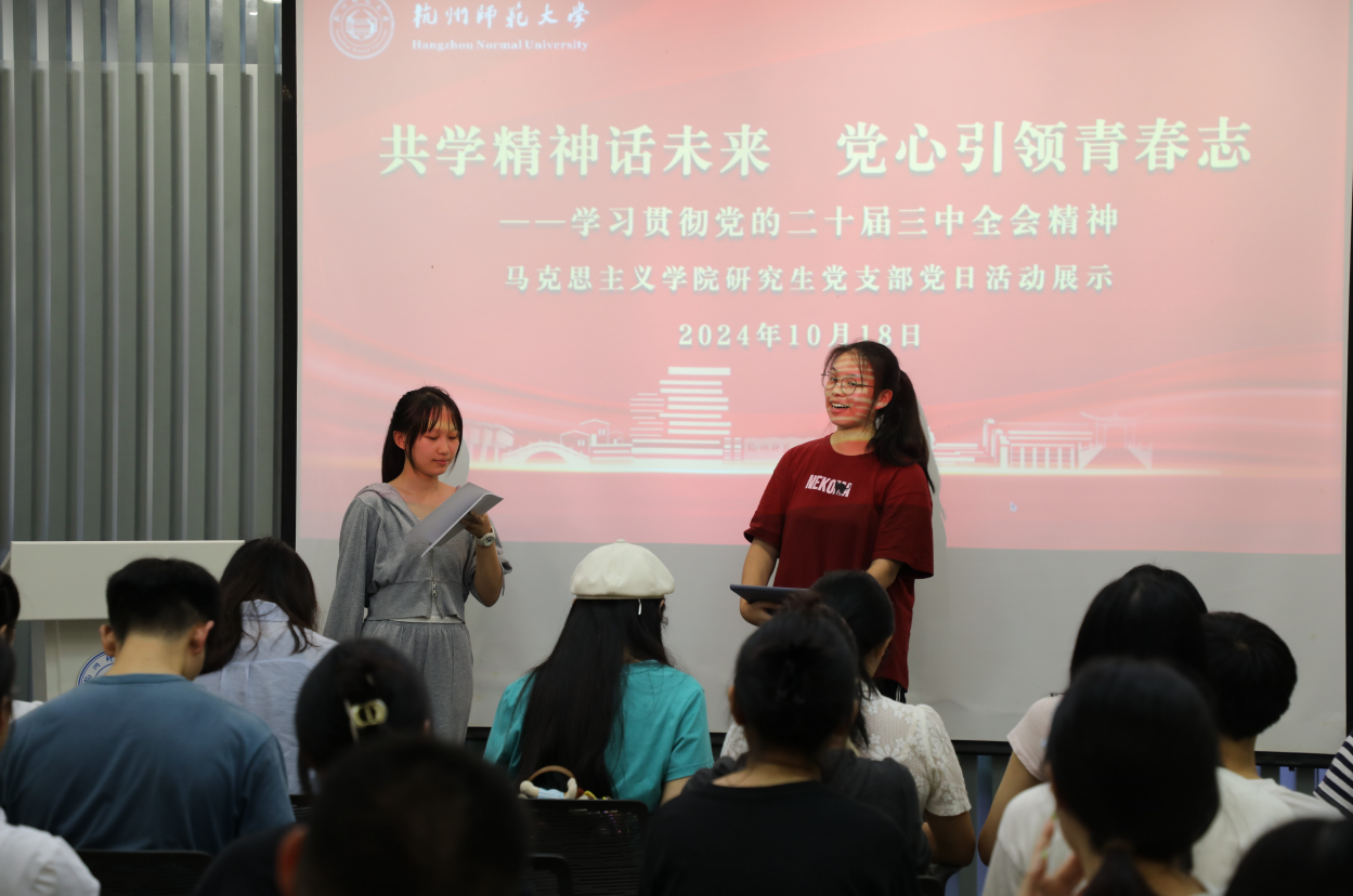 党的二十届三中全会是在新的历史起点上进一步全面深化改革、推进中国式现代化的总动员、总部署,对于实现中华民族伟大复兴的中国梦具有重大而深远的意义。金牌影院 研究生党支部积极响应号召,10月18日在党员之家以“共学精神话未来,党心引领青春志”为主题,组织开展了一场精彩纷呈的党日活动展示,通过 “微剧场”“微宣讲”“微分享” 三个环节,深入学习贯彻全会精神。