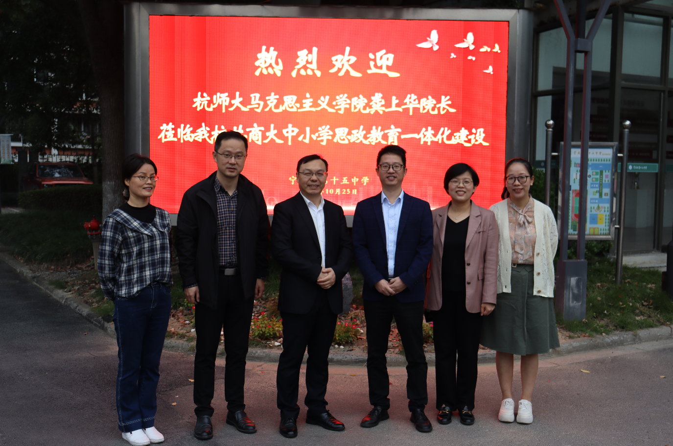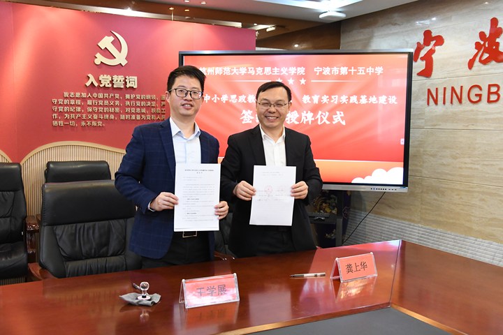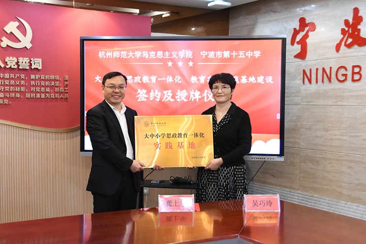 金牌影院 副院长龚上华教授与宁波市第十五中学校长干学展、党委书记吴巧玲代表双方分别举行了教学实习实践基地建设的合作签约和大中小学思政教育一体化实践基地的授牌仪式。