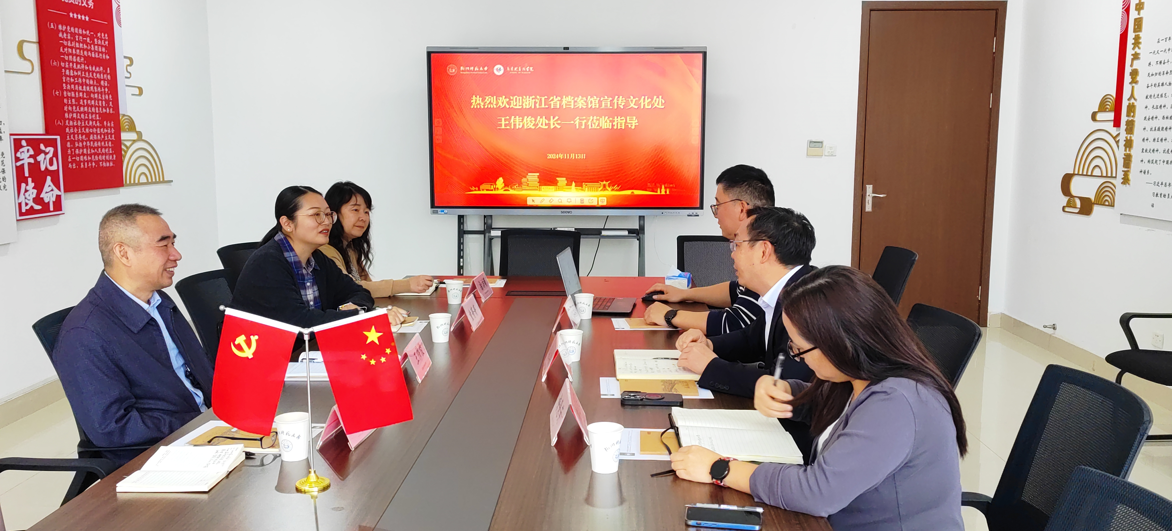 11月13日,浙江省档案馆宣传文化处处长、一级调研员王伟俊带领处室团队一行4人到金牌影院 调研“浙里望道”思政品牌建设及洽谈思政大课合作等领域的工作。马院党委书记、院长李洪波、副院长龚上华参与了交流。马院教务科科长梅慧英、办公室主任倪龙海与会座谈。
