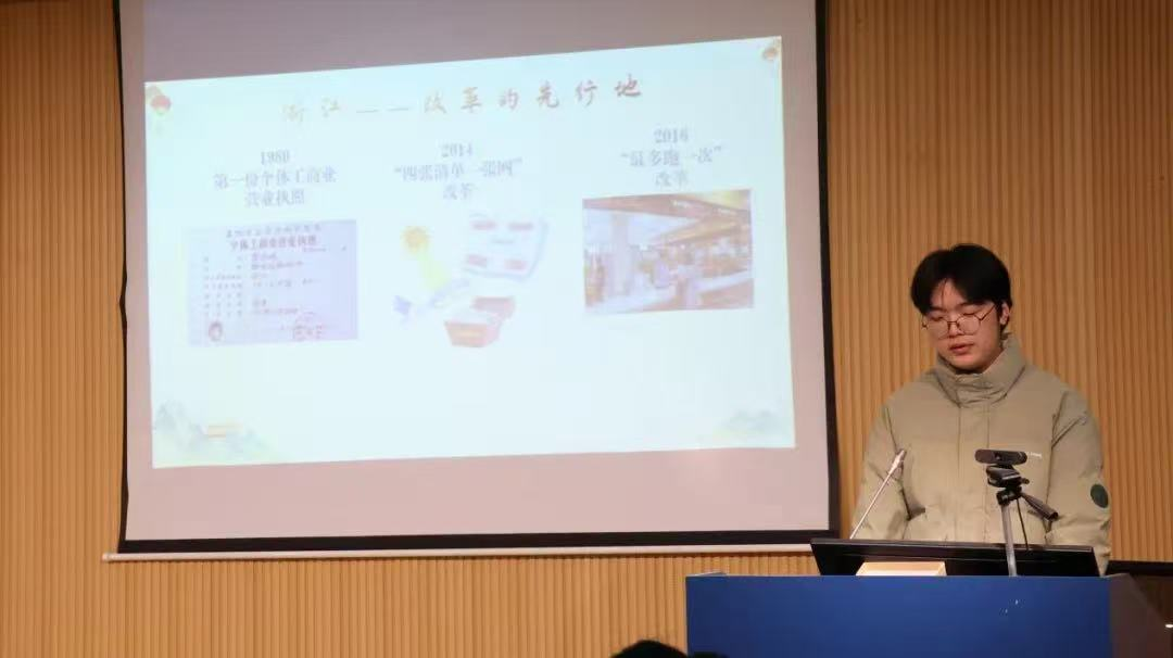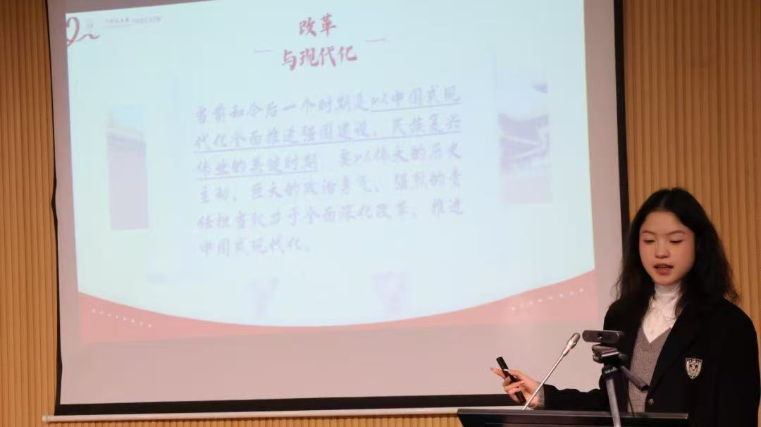 其次是同学们的微分享小讲堂活动。刘怗励同学分享了关于00后如何在改革开放进程中发扬历史主动精神的理解和感悟。“弄潮儿向涛头立,手把红旗旗不湿。”我们青年要守牢红色、加深底色、创造新色,在进一步全面深化改革的大潮中勇做弄潮儿。