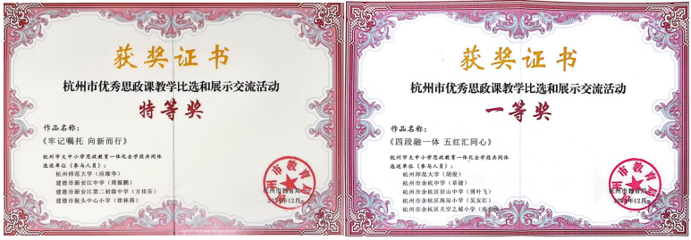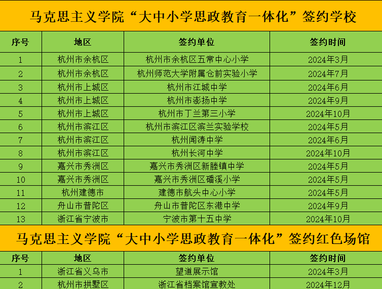 2024年,学院与13所中小学、2个红色场馆进行大中小学思政教育一体化建设签约,建立思政教育一体化研究实践基地。与仓前实验小学、五常小学成立家校社协同育人新红色教育联盟单位,依托“家校社协同育人新红色教育联盟”平台,打造大中小学思政教育一体化名师工作室;结合暑期社会实践,发挥师范专业优势,将家校社协同育人与社会实践相结合,带领思政本科生前往上城区青年路社区、天新社区、金色黎明社区、俞章社区,拱墅区德胜新村社区、河罕上社区、金星社区,临平区小林社区、塘栖村、鸭兰村,西湖区政苑社区等20余个社区进行社会实践,探索走出一条大中小纵向衔接、家校社横向联动的思政教育一体化的杭师大模式。借助“@学习·杭青思”市属高校思政教育联合体平台,做深做实“学在杭”“行在杭”“讲在杭”“研在杭”“教在杭”五大行动,努力打造具有杭州辨识度的高校思政教育样本。在浙江省大中小学思政课一体化示范“金课”展示活动中,金牌影院 许占鲁老师与杭州高级中学、杭州市惠兴中学、杭州市钱学森学校的思政教师共同打造的《新质生产力》获一等奖。在2024年度杭州市社科规划“大中小学思政教育一体化建设”专项课题中立项两项。在杭州市优秀思政课教学交流和展示活动中,金牌影院 教师荣获1个特等奖、1个一等奖、3个二等奖。