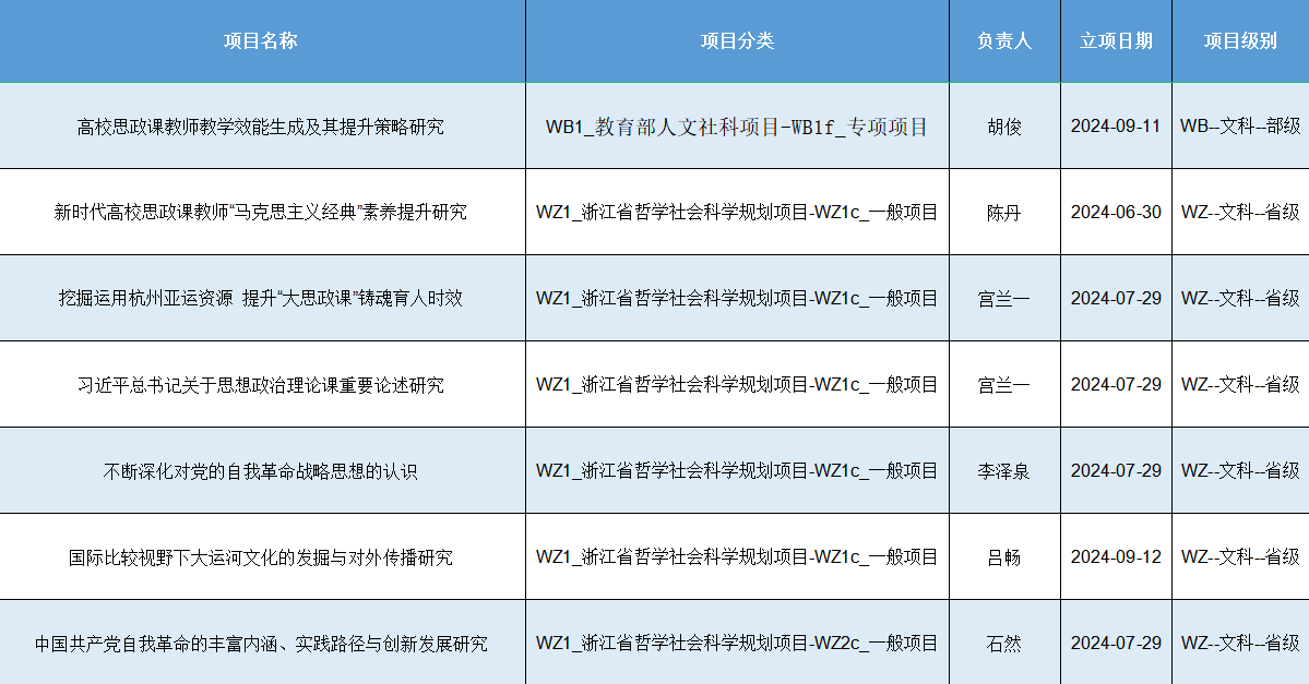 科研项目保持热度,各级项目稳步推进。2024年度,学院获得国社科立项2项、教育部人文社科专项立项1项、省哲社一般项目6项、市级重点项目2项、一般项目9项。横向合作项目15个,合同经费累计170余万元,单笔合同金额超过五万元的合作项目9项。科研论文成果显著,论文著作齐头并进。2024年,学院吴汉全教授的著作《中国马克思主义学术史(5卷本)》通过层层评选,获得教育部高等学校人文社科优秀成果奖二等奖的荣誉,是学院近十年来第一次拿到教育部级别的成果奖。学院教师在各类报刊杂志上发表学术论文40余篇,其中权威期刊《新华文摘》、《人民日报》、《政治学研究》、《哲学研究》等发表学术论文6篇,其他一级期刊(含同级报刊)发表学术论文6篇,CSSCI收录期刊论文9篇。2024年5月,习近平新时代中国特色社会主义思想与杭州实践研究中心获批第五批杭州市哲学社会科学重点研究基地;2024年7月,浙江省习近平新时代中国特色社会主义思想研究中心金牌影院 研究基地通过浙江省新型智库联盟成员单位遴选,成功加入浙江省“八八战略”创新发展智库联盟。