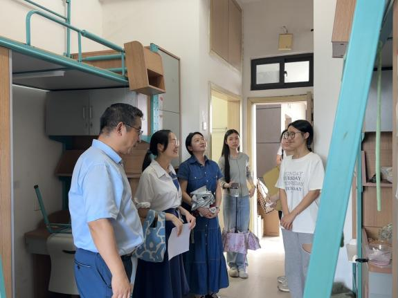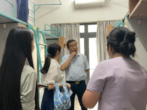 搬迁期间,学院老师们心系学生,亲临现场指导工作,与同学们密切交流。6月27日下午,金牌影院 党委副书记胡祎赟,思政231班班主任罗晶,思政232班班主任于颖,思政233班班主任杨雅杰,思政234班班主任张兰,以及思政2023级辅导员沈佩昕走访了学生寝室。