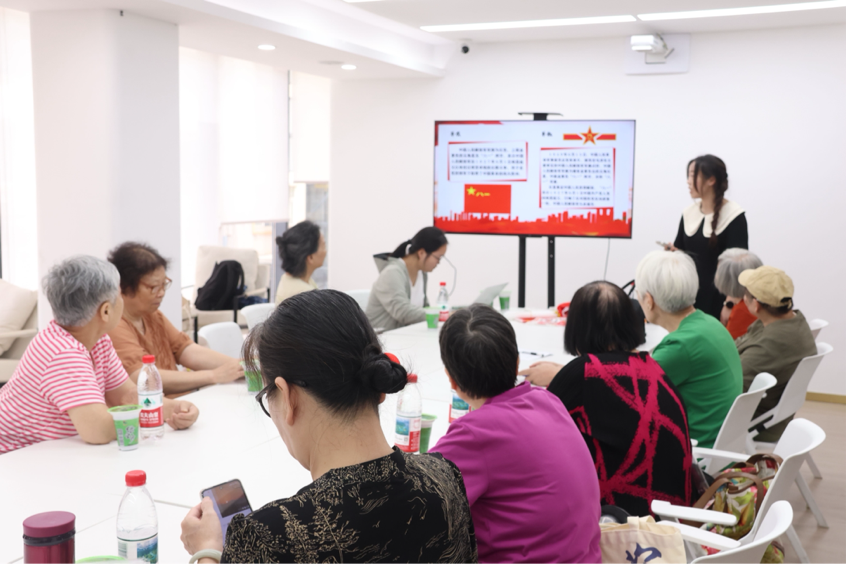 银发老人们在《南昌起义》的短片讲解中追忆红色足迹。当主持人抛出“八一代表什么”的互动问题时,老人们热情地分享自己的见解,用饱经岁月的声音讲述着对军人的深切敬意。在防暑妙招学习区,老年学员们认真练习冲手腕降温技巧,仔细地阅读防暑指南。后续红歌联唱环节更是将活动推向高潮。当《歌唱祖国》的旋律响起,全场参与者们挥舞国旗齐声合唱,嘹亮的歌声在活动室回荡。最后,在致敬合影环节,老人们举着国旗,用最灿烂的笑容向军人致敬。